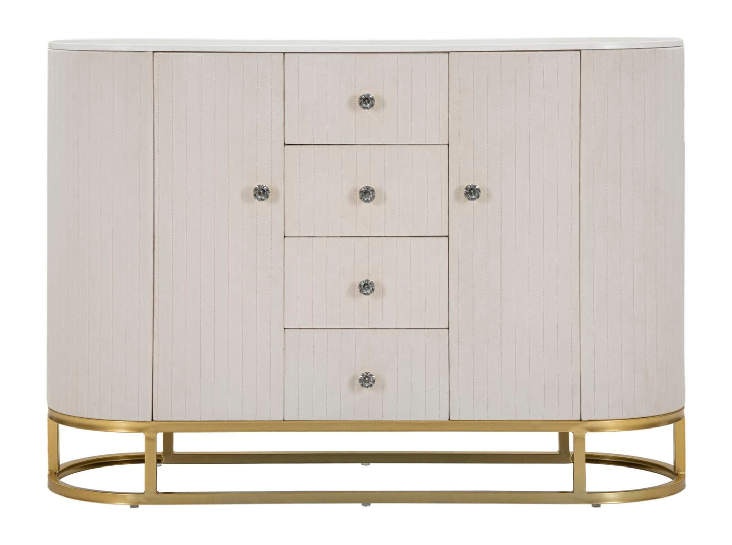 Cabinet with bevelled sides with 2 doors and 4 drawers. The golden metal structure, the upper part covered in cream padded fabric and the top made of imitation marble create an elegant whole that can be combined with any type of furniture.