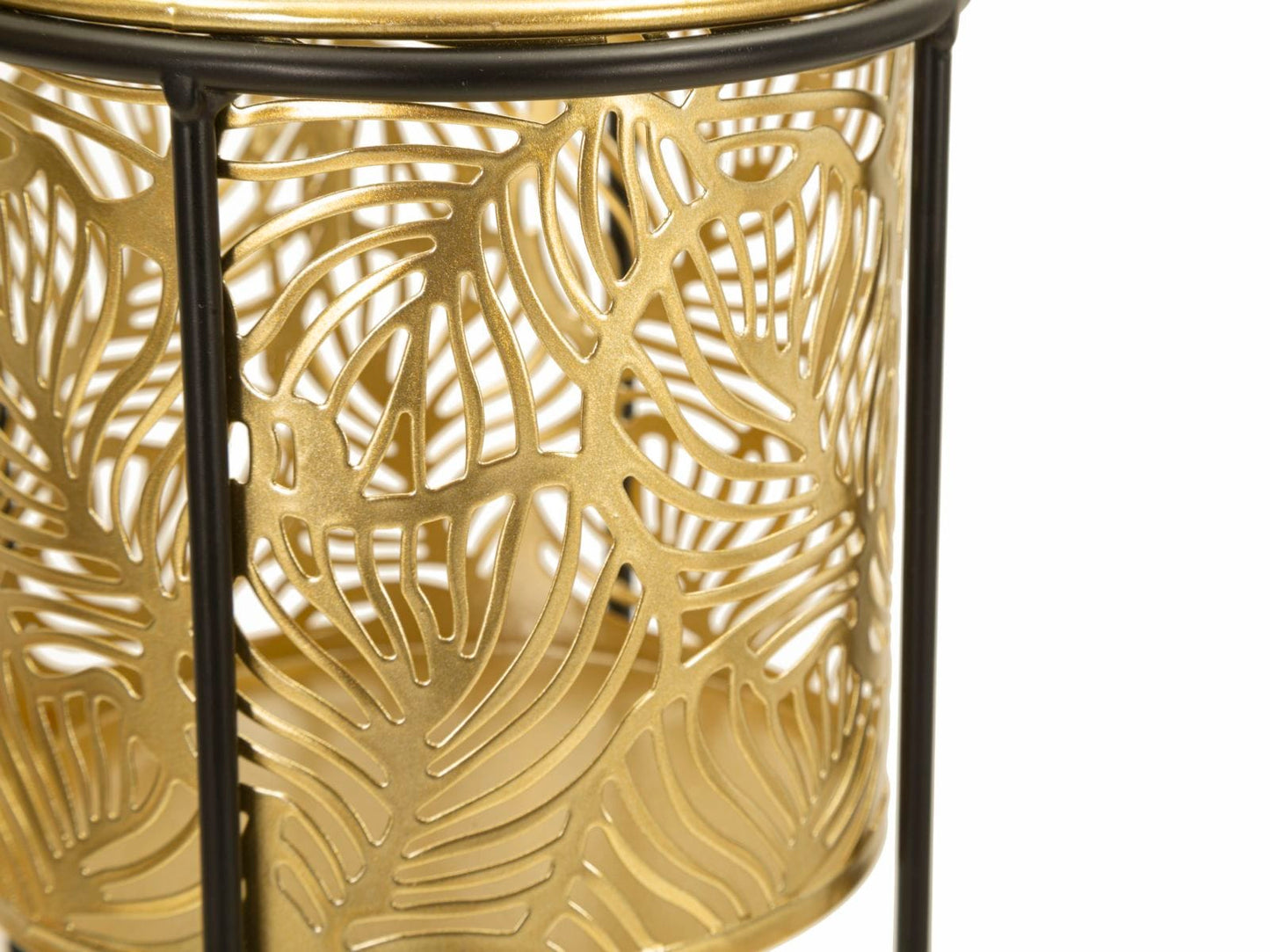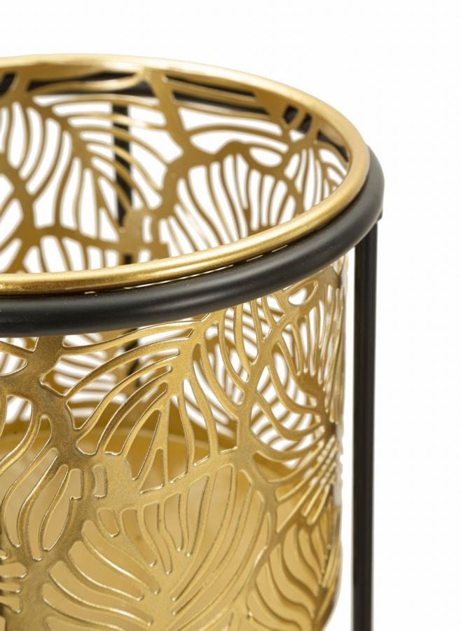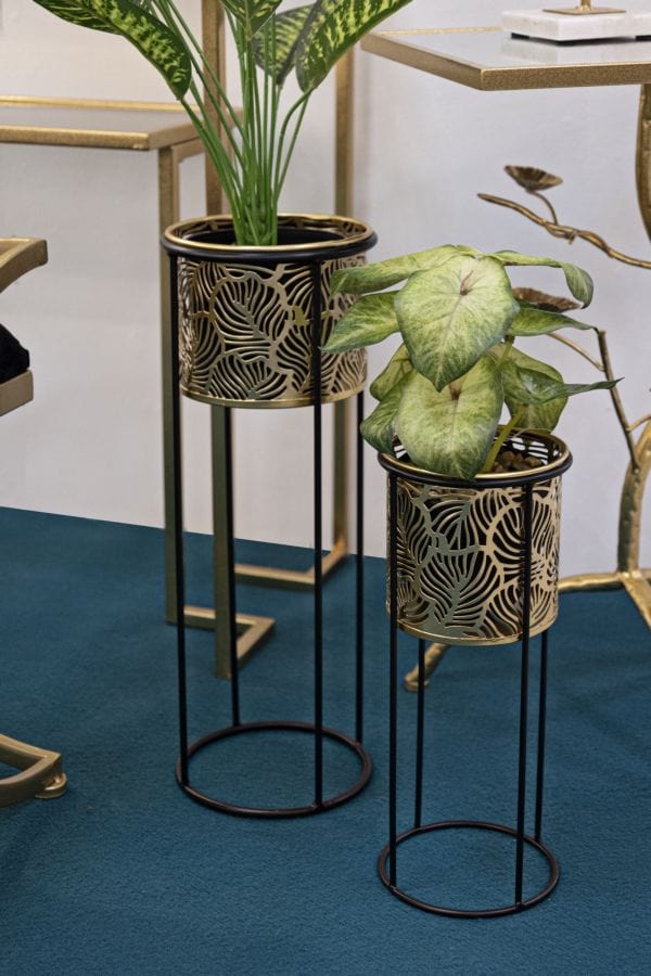 Pair of golden metal vase holders elegantly decorated with carvings that recall leaves. Complete with black metal support. The pots are removable from the supports.