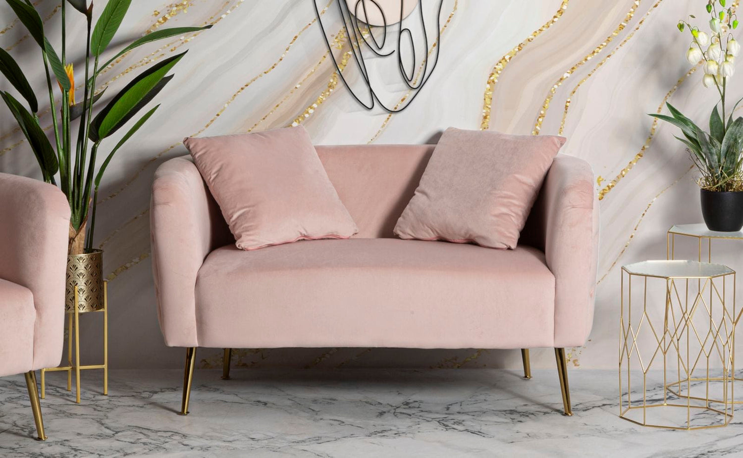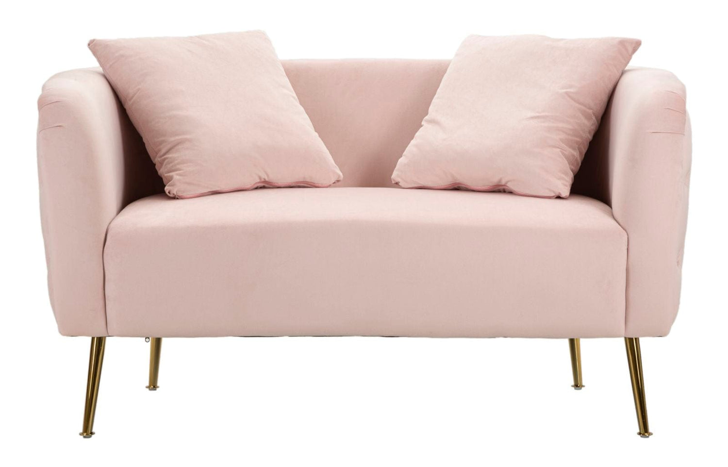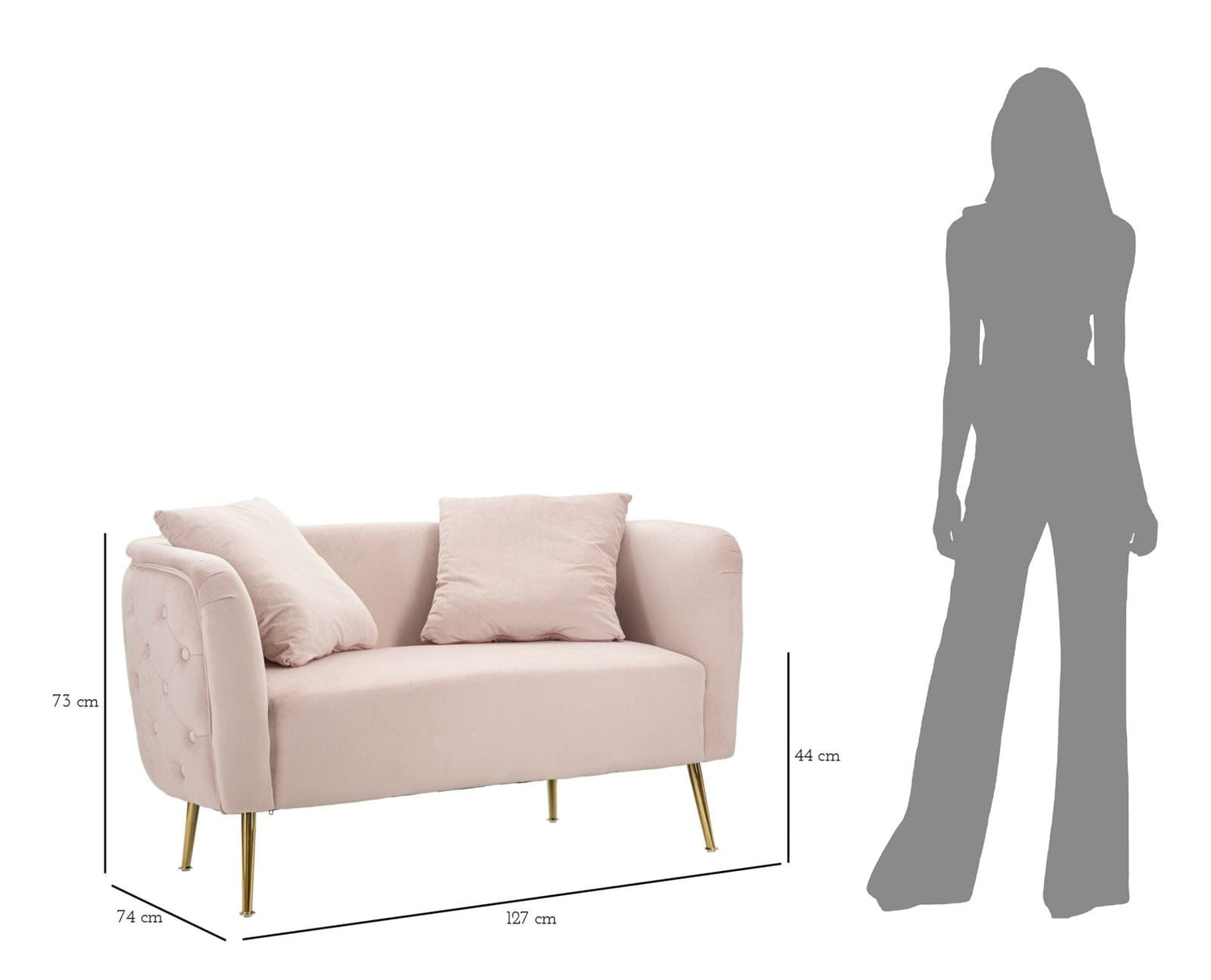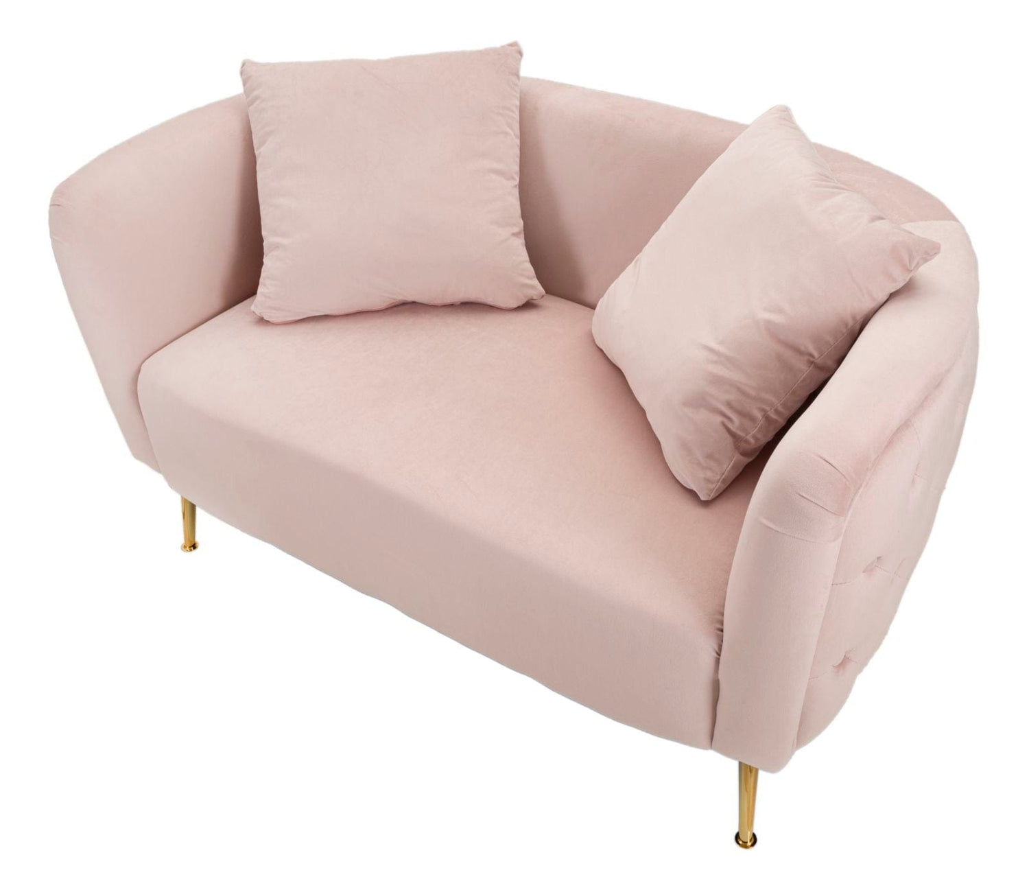 2-seater sofa in pink padded fabric with comfortable armrests. The color of the fabric together with the elegance of the golden legs give a touch of class to any room. Complete with 2 cushions.