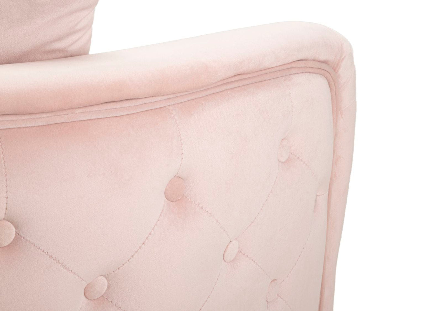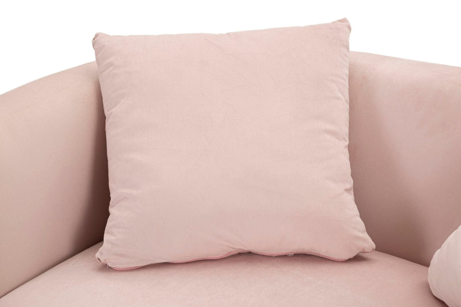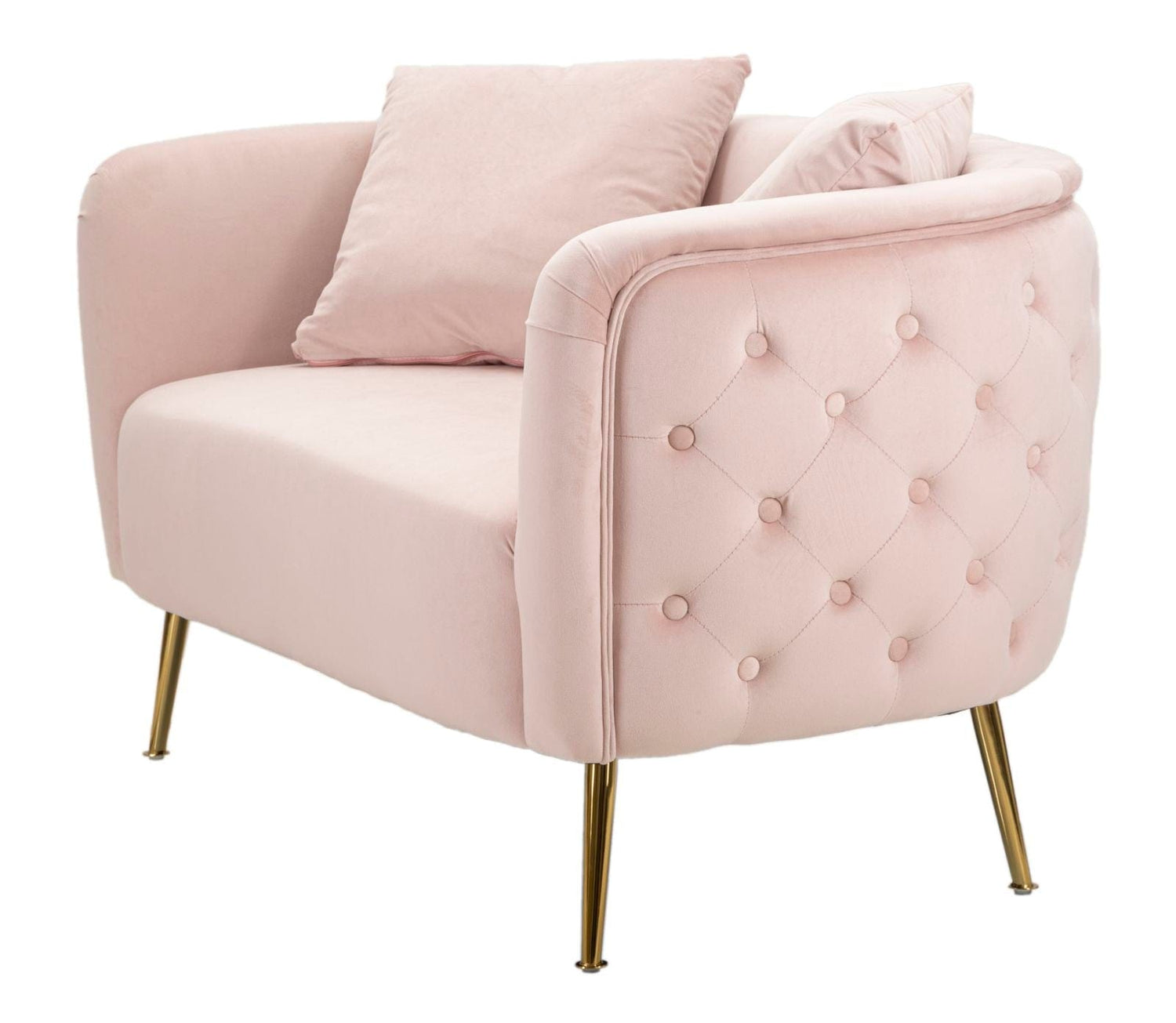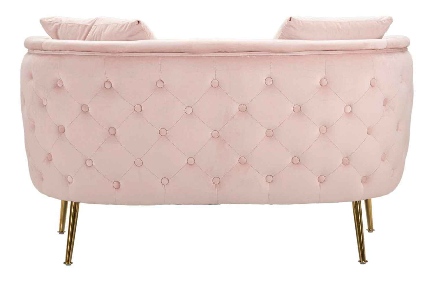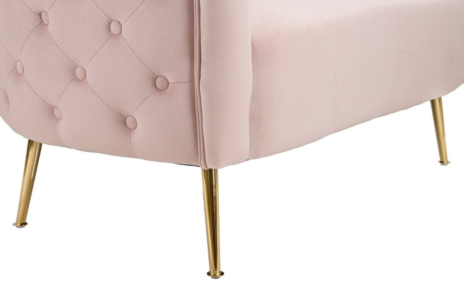 2-seater sofa in pink padded fabric with comfortable armrests. The color of the fabric together with the elegance of the golden legs give a touch of class to any room. Complete with 2 cushions.