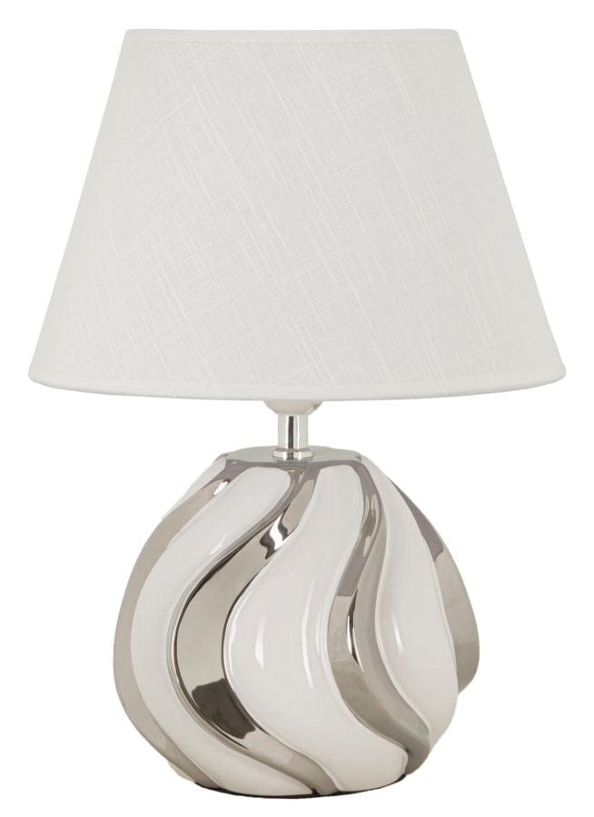 White ceramic lamp with silver finishes with a simple and elegant design. Complete with white fabric lampshade.