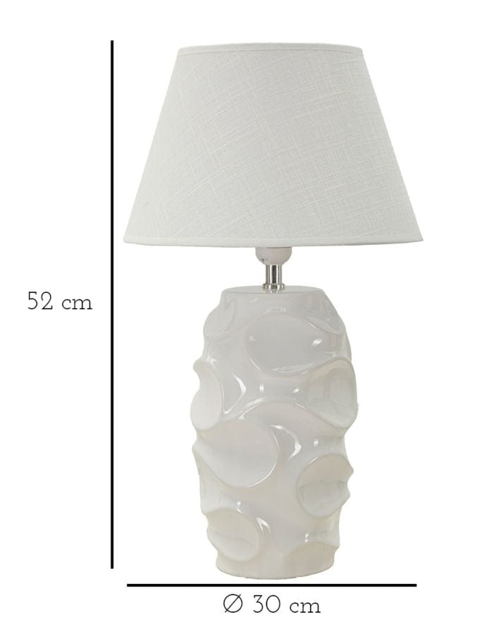 White ceramic lamp with soft and rounded shapes. Complete with white fabric lampshade.
