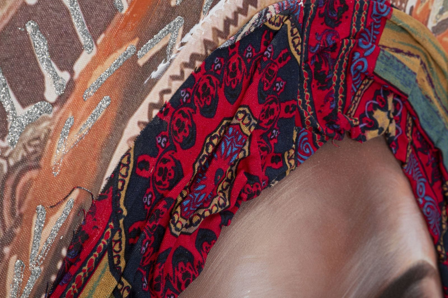 Painting on canvas complete with wooden frame depicting a woman's face with headdress with elegant fabric applications.