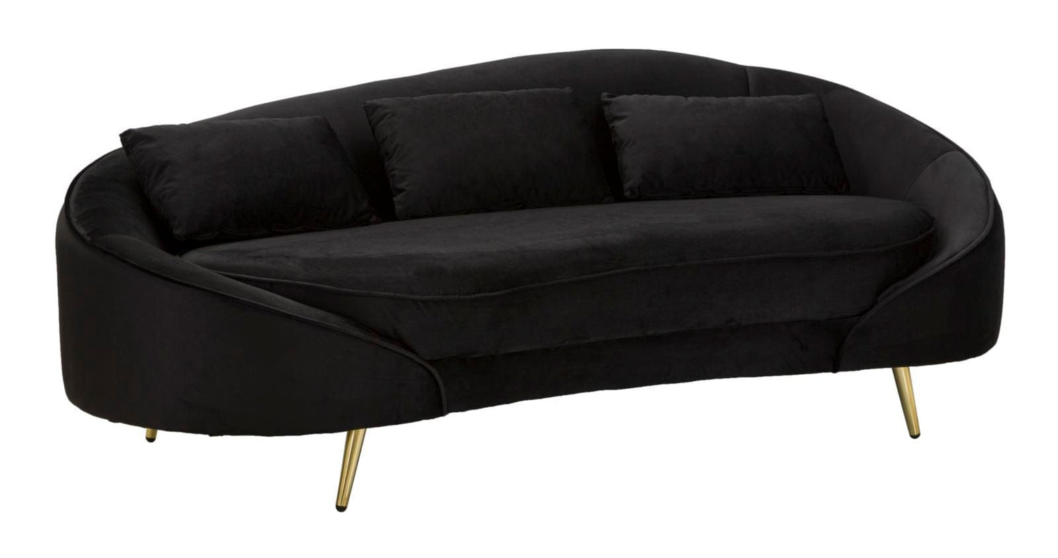 3-seater sofa in black padded fabric with soft and enveloping lines, the golden metal legs give a touch of class and brightness. Complete with 3 cushions.