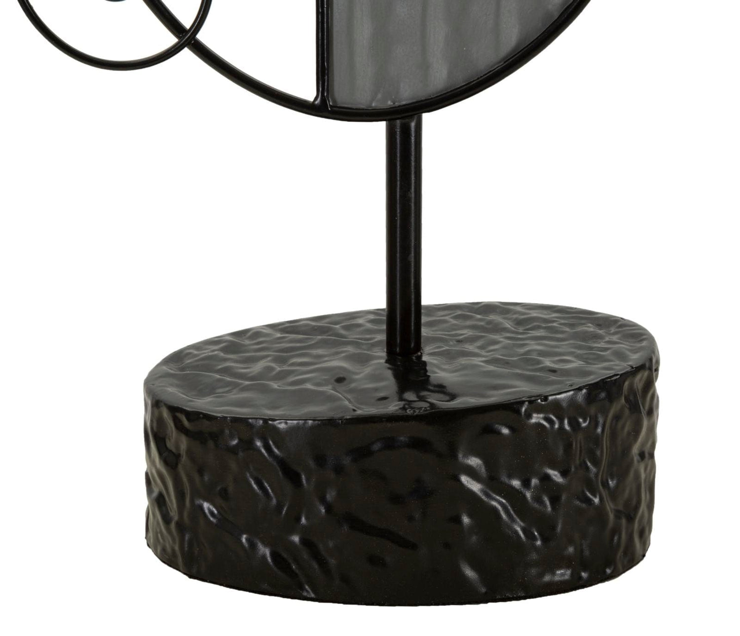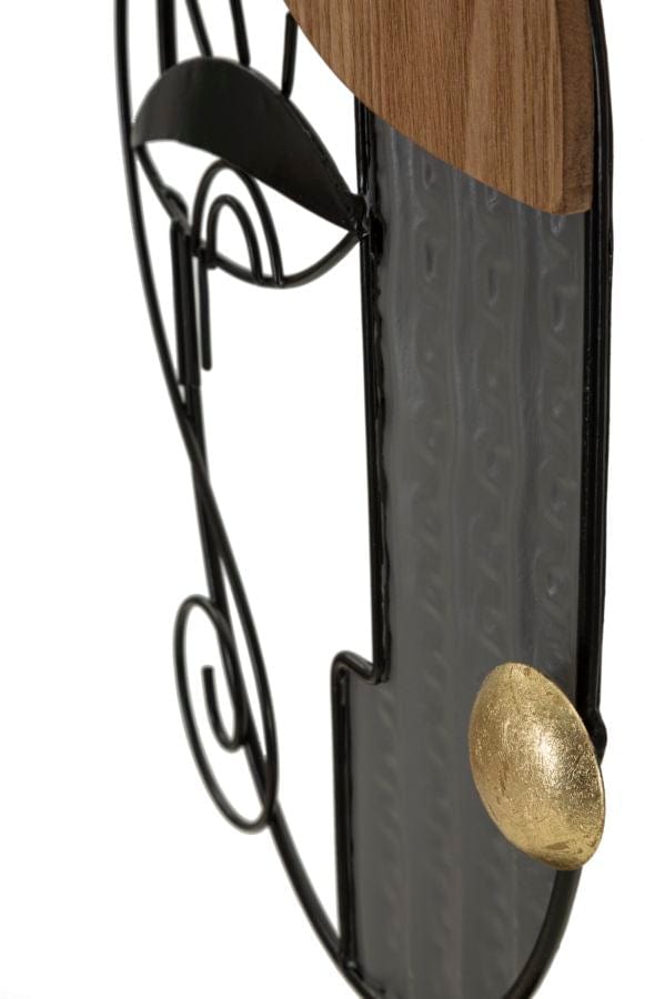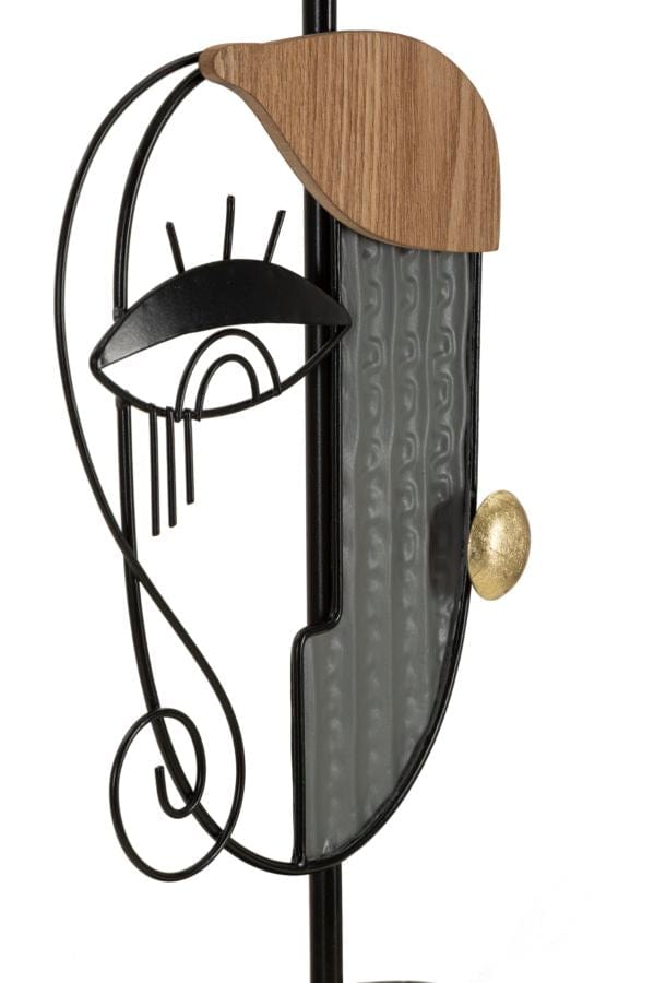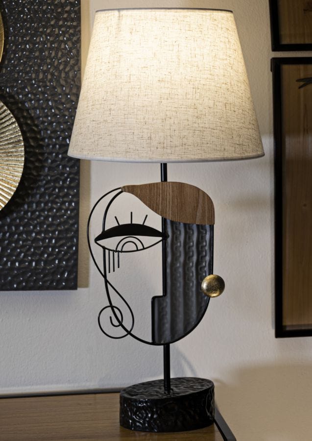 Table lamp in metal and wood embellished with faces that recall cubist art. Complete with white fabric lampshade.