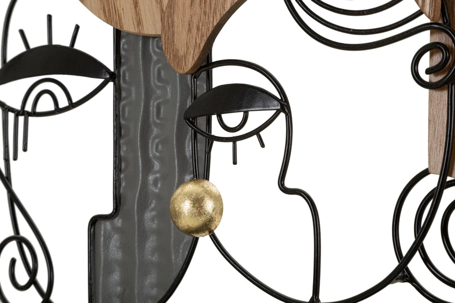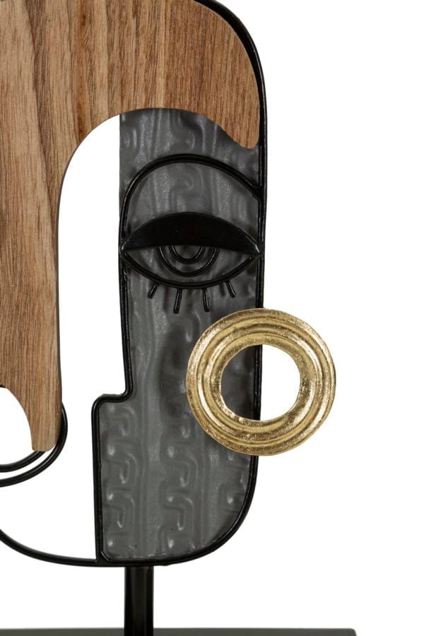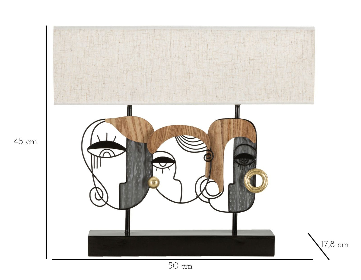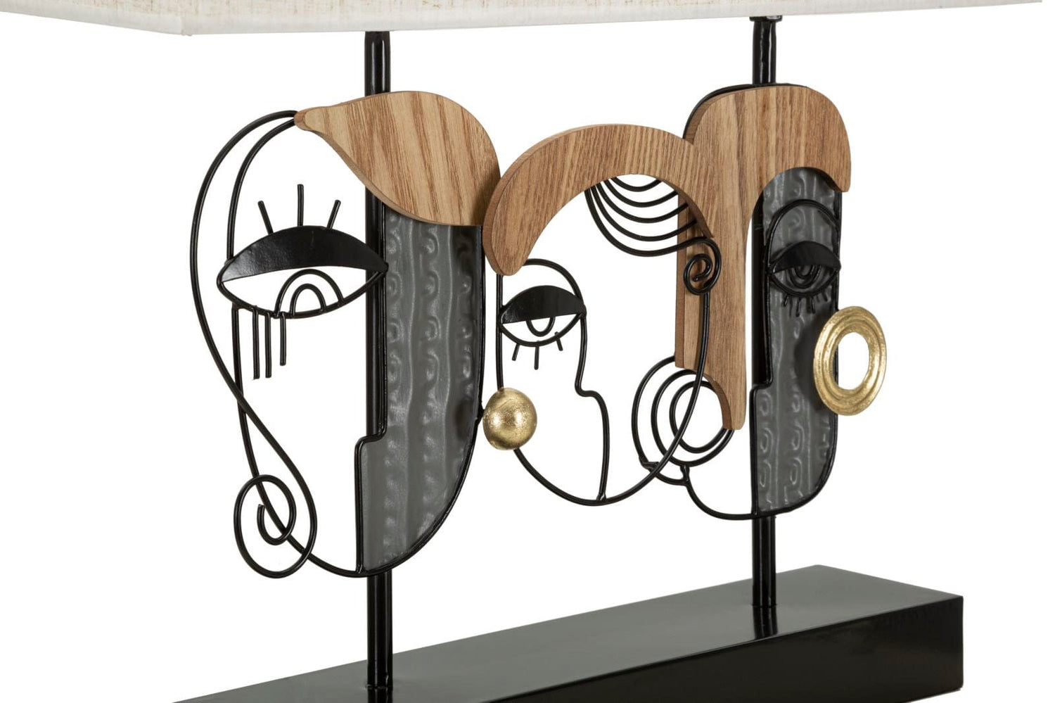 Table lamp with 2 light points in metal and wood embellished with faces that recall cubist art. Complete with white fabric lampshade.