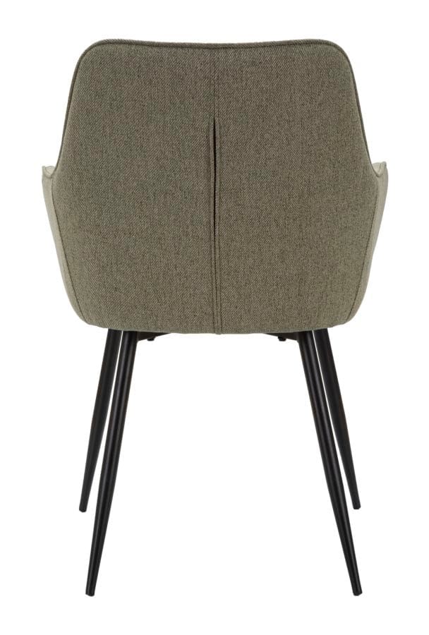 Set of 2 upholstered fabric chairs complete with practical armrest. The fabric together with the black metal legs give a touch of class to any room.
