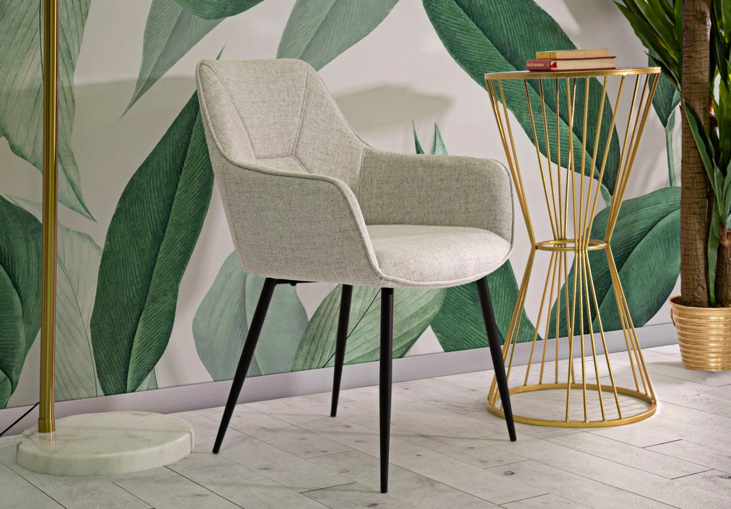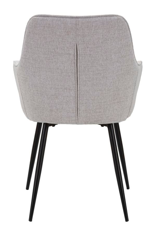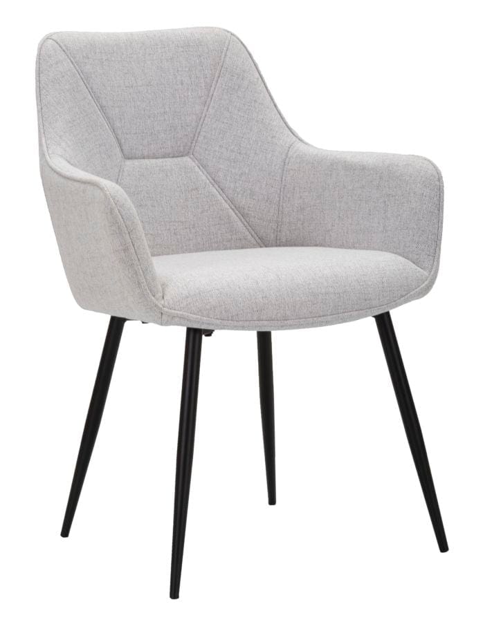 Set of 2 upholstered fabric chairs complete with practical armrest. The fabric together with the black metal legs give a touch of class to any room.