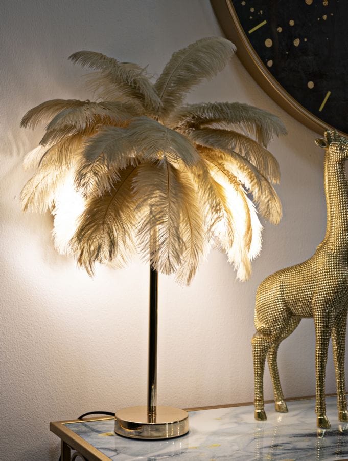 Table lamp in golden metal with 2 light points and lampshade made up of white feathers.