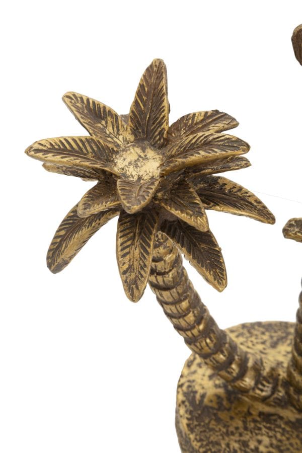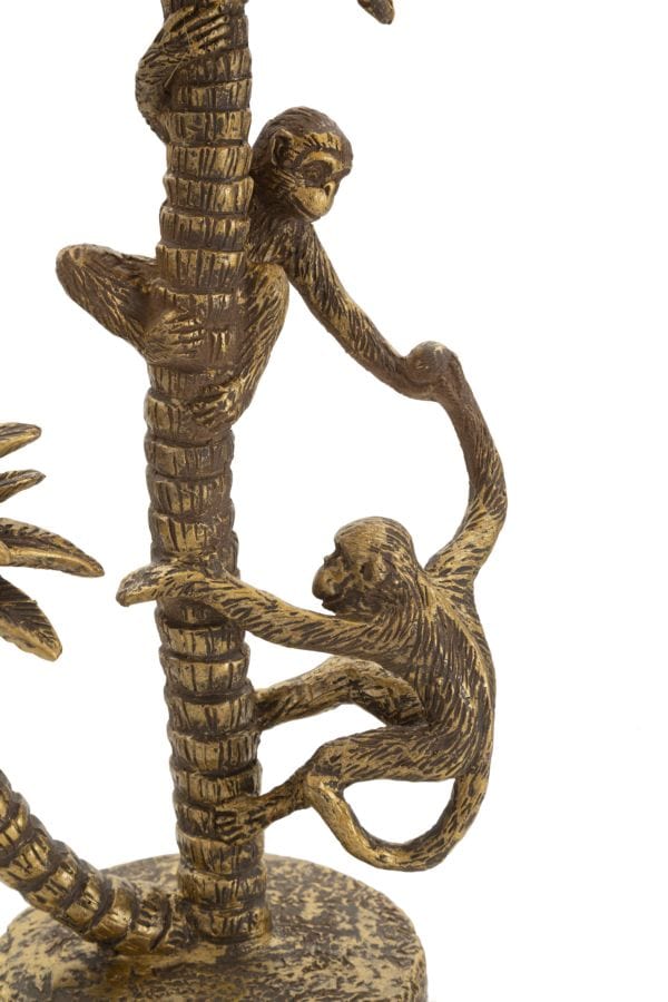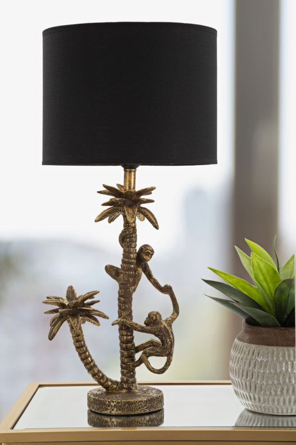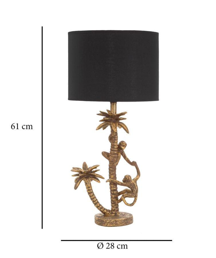 Table lamp in golden resin with black fabric lampshade. The structure depicts a coconut palm with cute monkeys. A touch of joy to combine with any type of furniture.