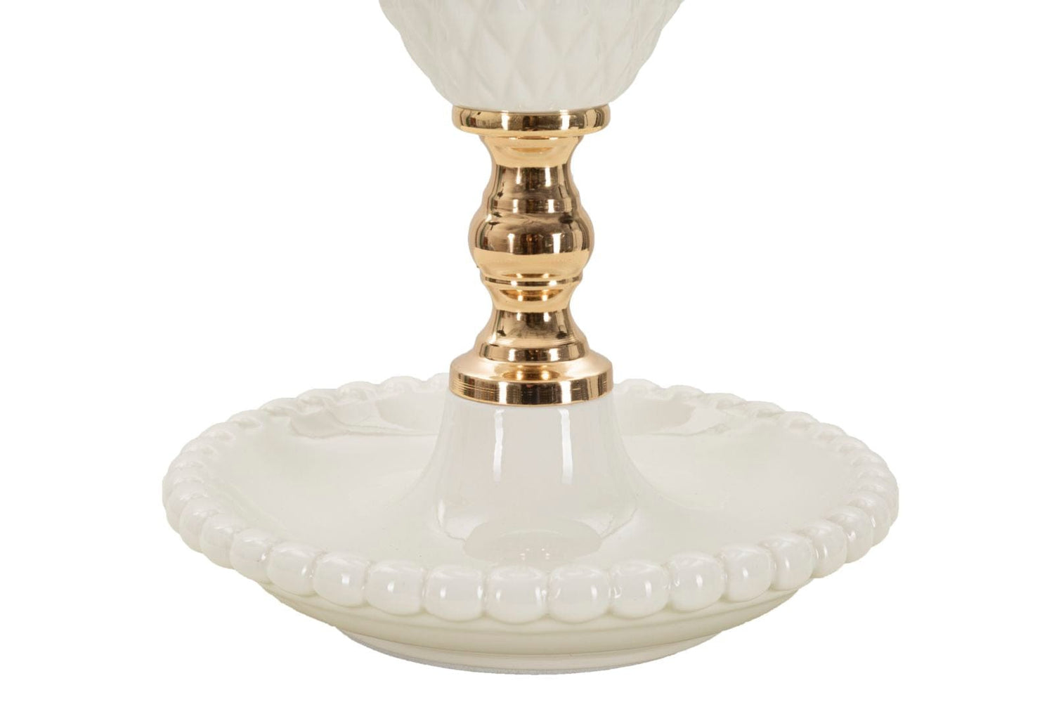 White ceramic lamp with golden finishes with a simple and elegant design. Complete with white fabric lampshade.