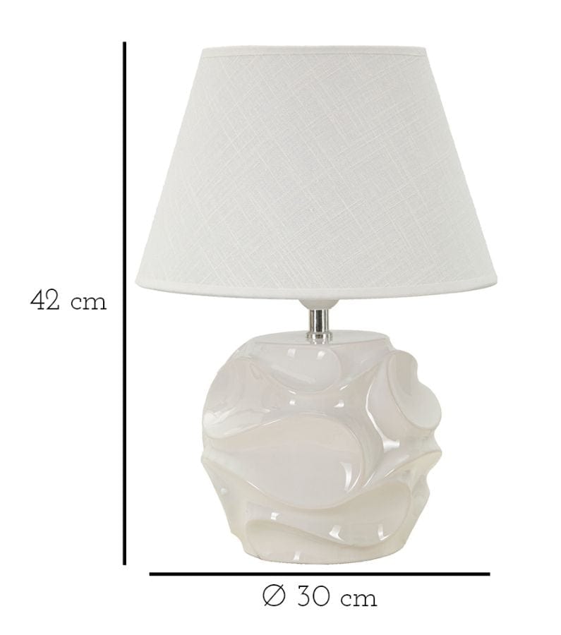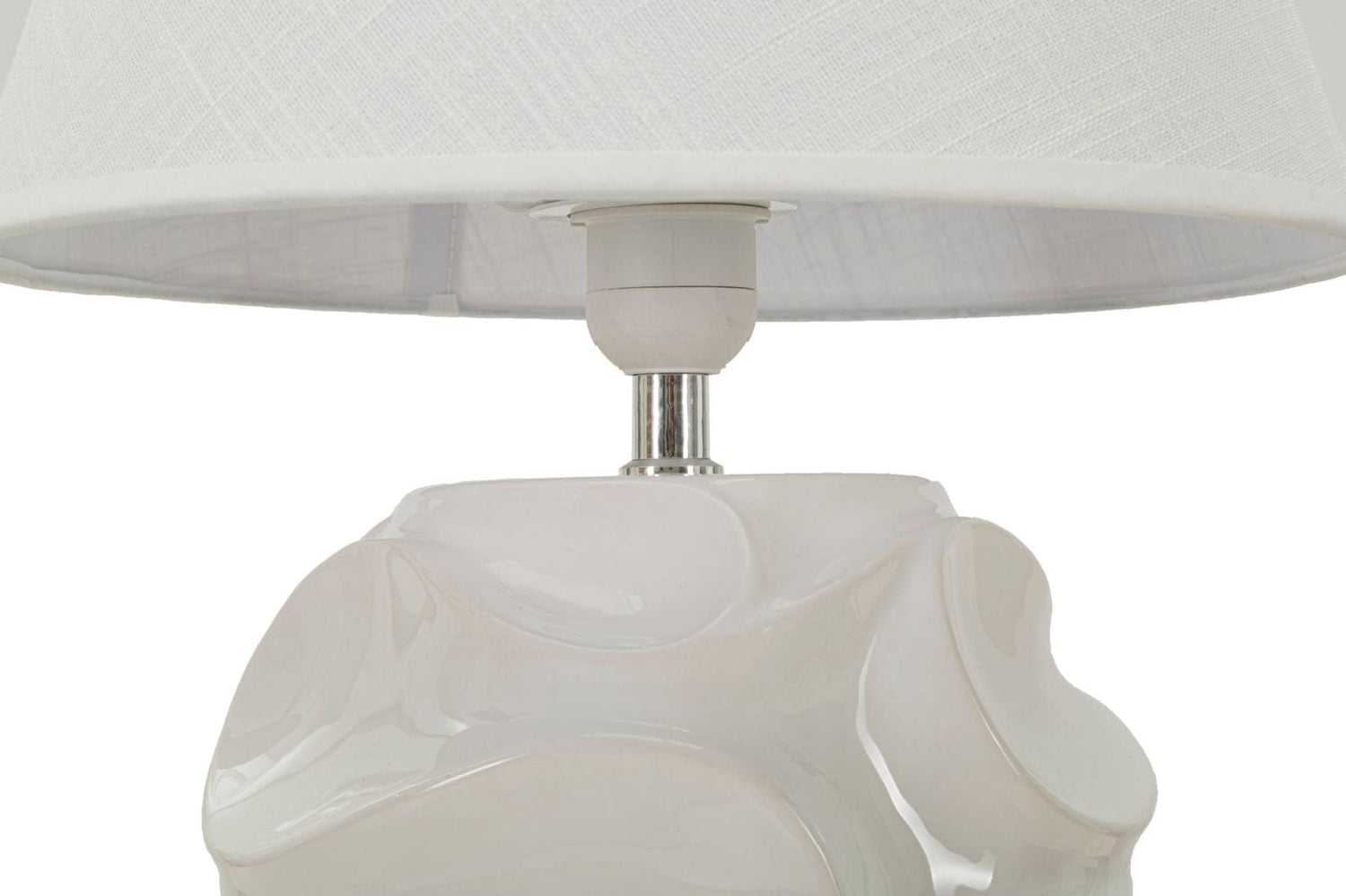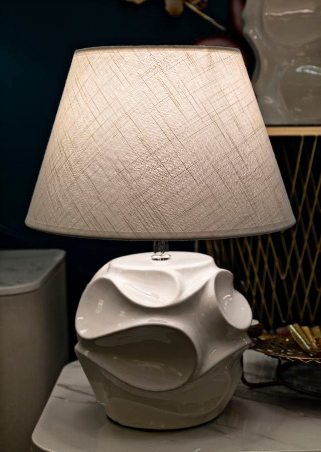 White ceramic lamp with soft and rounded shapes. Complete with white fabric lampshade.