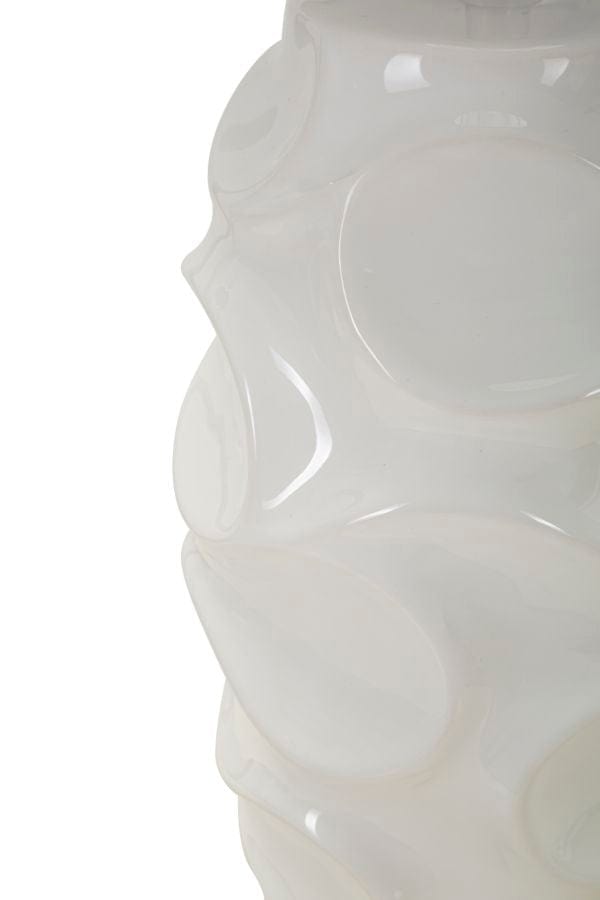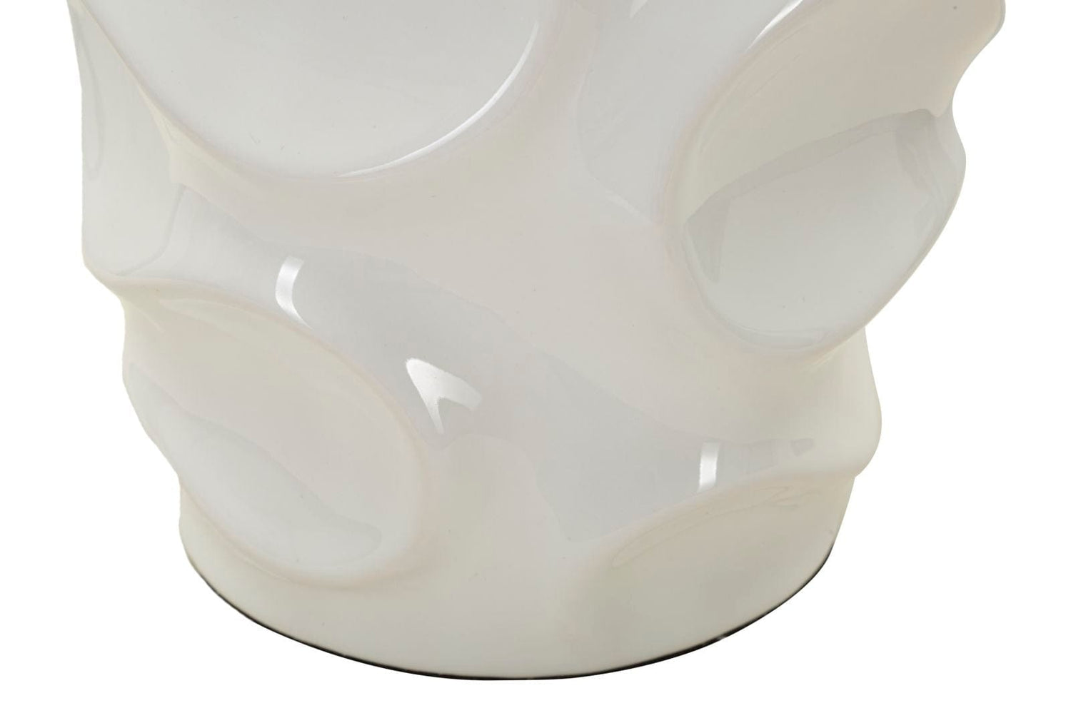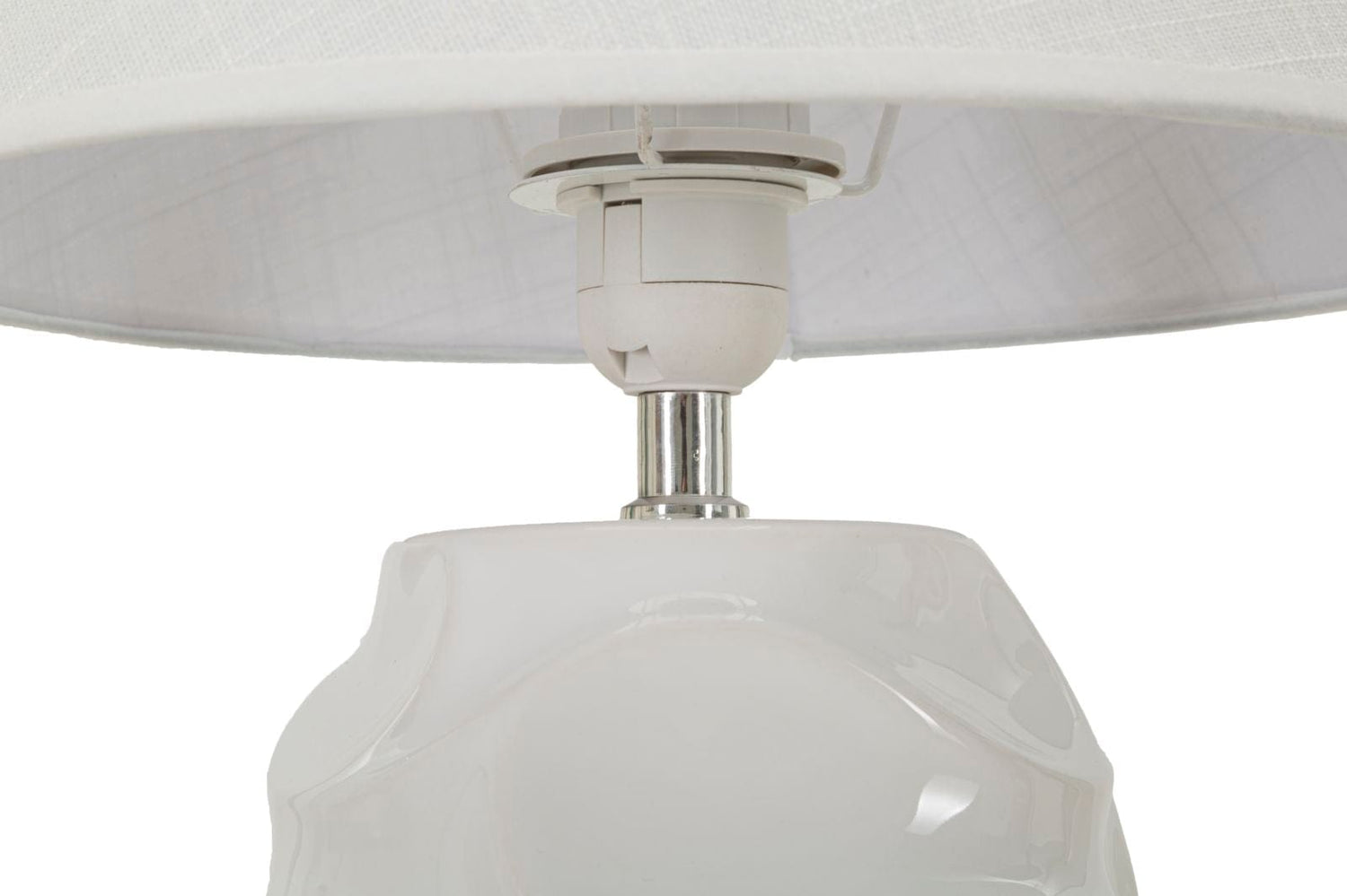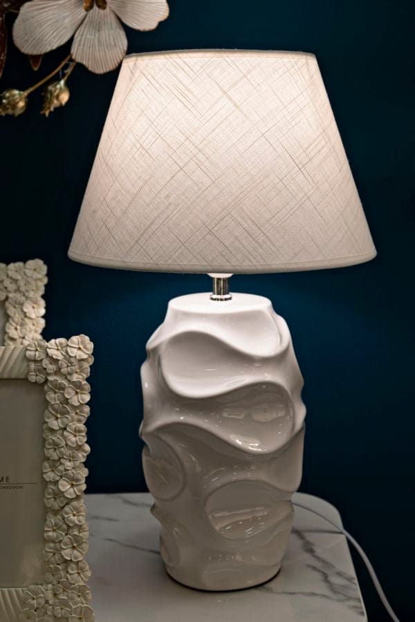 White ceramic lamp with soft and rounded shapes. Complete with white fabric lampshade.