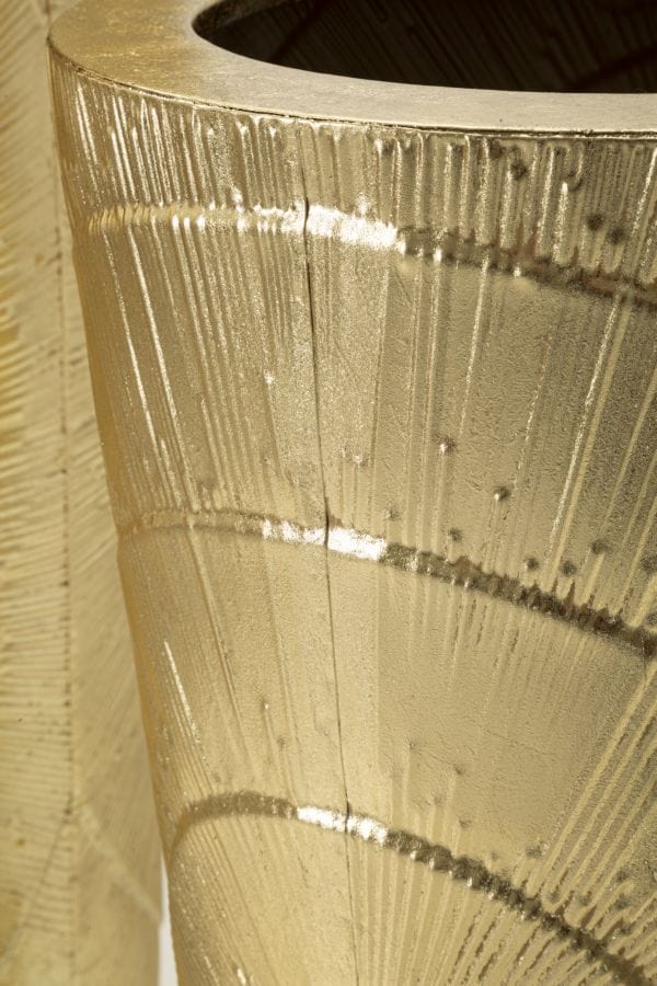 Set of 3 golden metal vases with elegant circular decorations in relief.