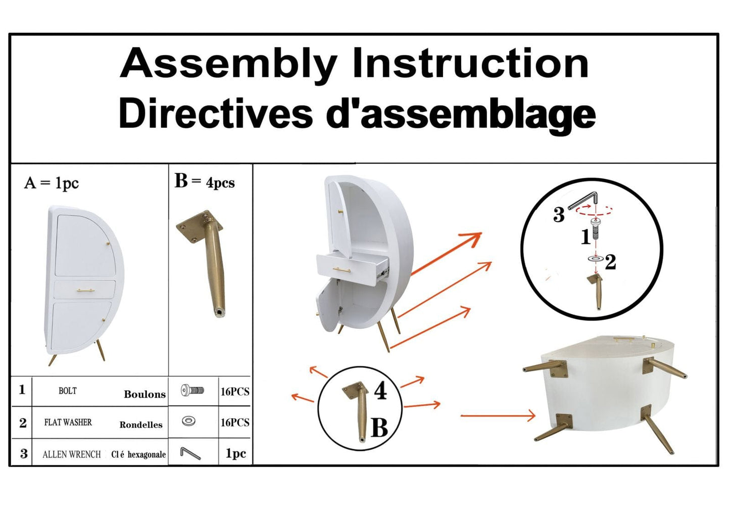 White wooden furniture with rounded lines that recall the modern antiques of the 70s. Complete with 2 doors and drawer. Golden metal legs to assemble.